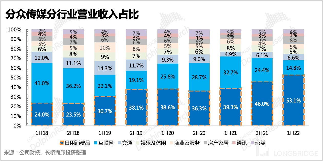 落到分众自己身上,恐怕就与收入结构也有关系了。在中报的数据披露中,互联网企业的广告投放收入还占比分众的 15%,虽然已经大幅降低,但仍然是继日用品之外的第二大分类。