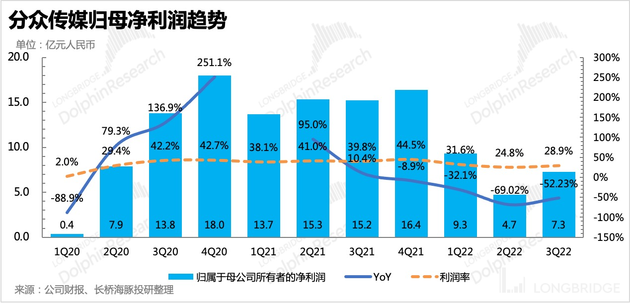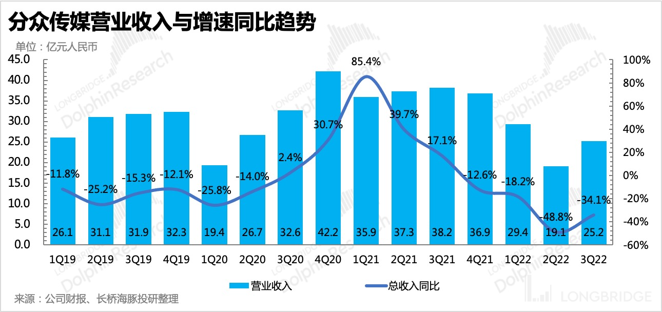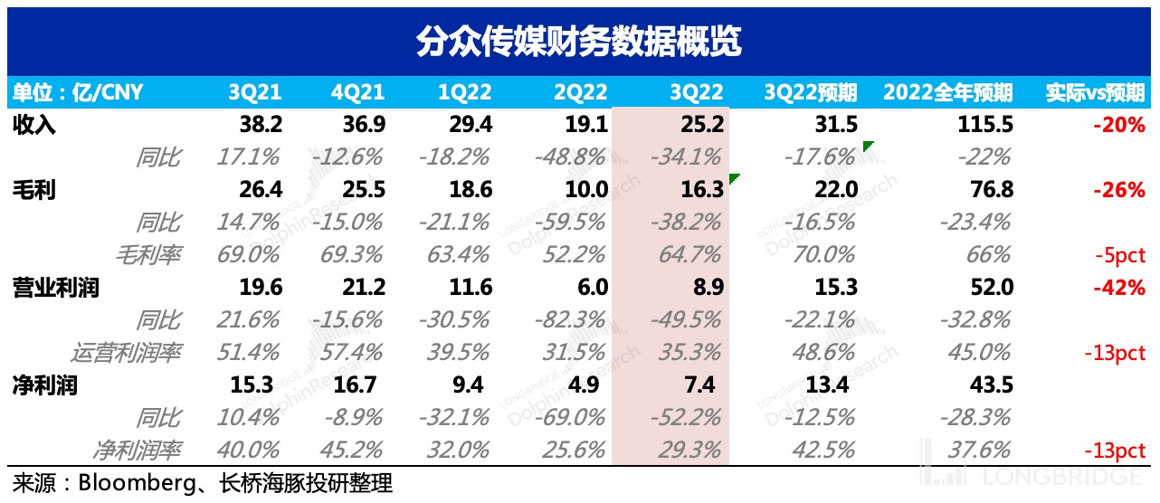 1、疫情反复,创收吃力。三季度单季收入 25.2 亿元,同比下滑 34%。从绝对值上来看,甚至不及一季度(29 亿),而一季度往往是分众等线下媒介的淡季。市场也没想到会出现这种情况,普遍的预期都给到 30 亿以上。