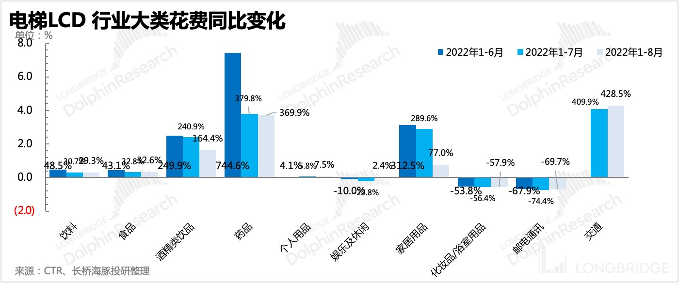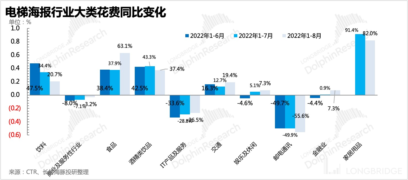不过今年以来在电梯广告上显著增加投放量的,也有不少,而 6、7、8 月持续保持增长强势的有白酒、食品、医疗保健等领域,此外规模不大但增速显著的如家居、交通(电动汽车)等领域,虽然有个别品牌自身的新品上市营销影响,但整体上增幅可观,预计未来在分众中的收入占比都会进一步提升。