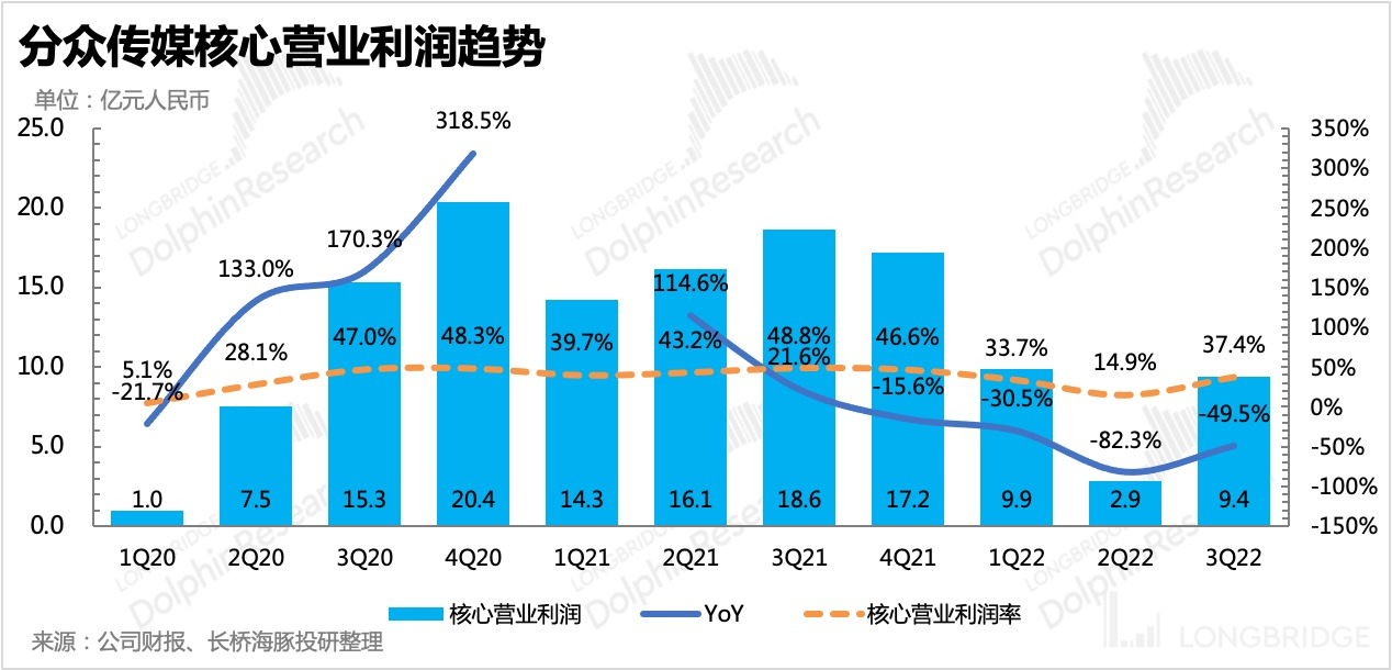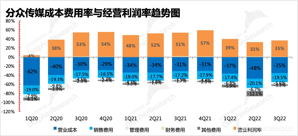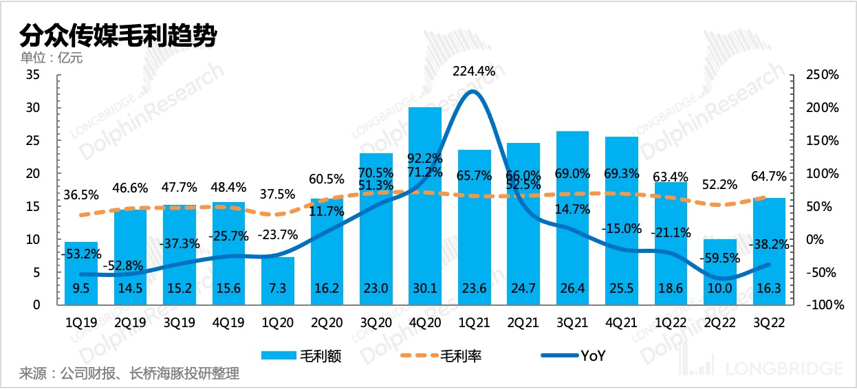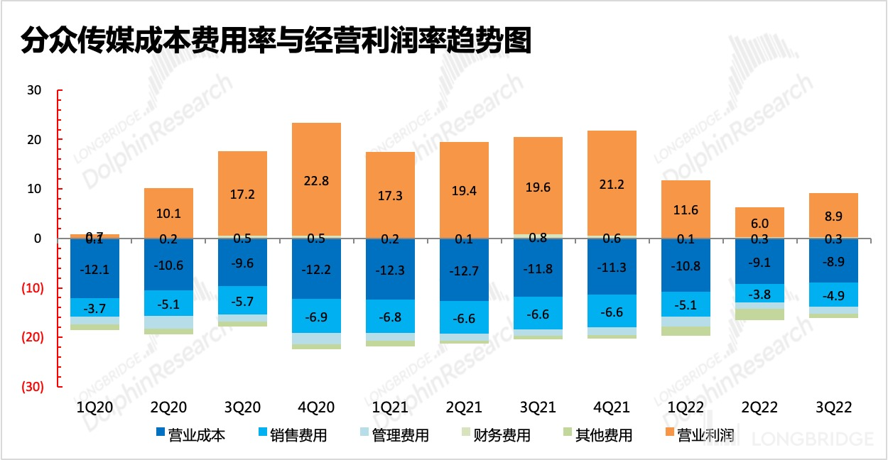 由于三季报没有披露具体的收入结构,海豚君简单根据行业情况做推测。从占比近 95% 的楼宇媒体(电梯广告)整个行业情况来看,虽然 6 月上海疫情结束,但 7、8 月的电梯广告花费增速并没有出现爆拉,也就是说,解封后商家的整体报复性投放并没有发生,只是部分戏份领域及个别品牌因为自己的新品规划上线而出现短期投放增加,如食品、白酒、电动车。