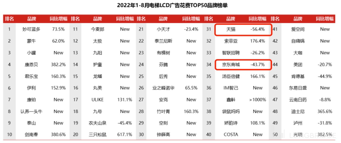 而整体互联网今年全能几乎都在降本增效中,虽然去年三季度不少互联网已经开始减少营销支出,但基数相对今年还是不低。而根据 CTR 数据,1-6、1-7、1-8 月,天猫、京东在电梯媒体上的广告花费还在同比 50%、30% 的下滑幅度,而这两家又属于分众的大客户,因此受到的影响也难以忽略。