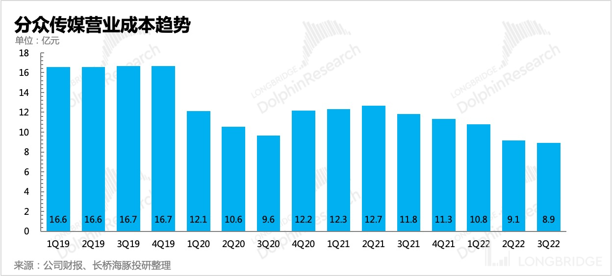 但三季度的营业成本绝对值却比二季度还要低,也显著优于市场预期,海豚君认为,除了团队优化带来的人工成本降低,也与分众在战略上撤出更多的影院媒体,以及在电梯点位上做的结构性调整有关,另一方面,可能疫情严重地区物业方也给予了一定优惠,本质上体现的是分众自身的成本管理能力和在产业链上的高议价权。