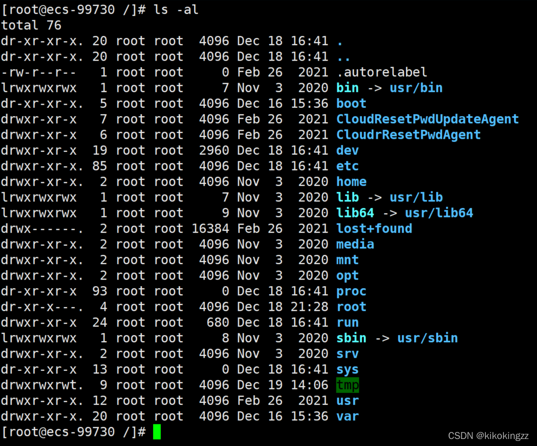 退到不能再退时 [root@ecs-99730 ~]# cd .. [root@ecs-99730 /]# pwd / #根目录 [root@ecs-99730 /]# cd .. [root@ecs-99730 /]# pwd / [root@ecs-99730 /]# cd .. [root@ecs-99730 /]# pwd /**根目录中包含了很多目录: **