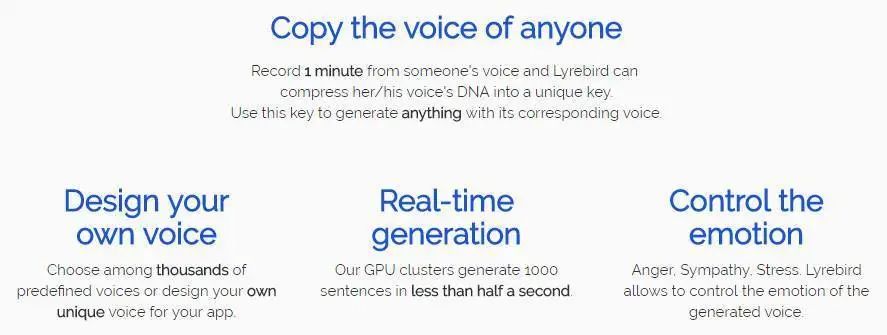 2017 年,加拿大 AI 初创公司 Lyrebird 开发了一种语音合成技术,声称他们的算法能用 1 分钟的样本音频克隆任何人的声音。