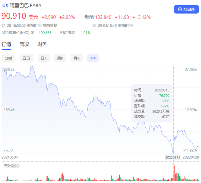 回看阿里的股价,在2020年11月到达巅峰,约为298美元/股,而到了现在,阿里股价最低仅有76美元左右,下跌幅度约为70%,根据最新市值计算,约1年半的时间,阿里的市值蒸发约6200亿美元。