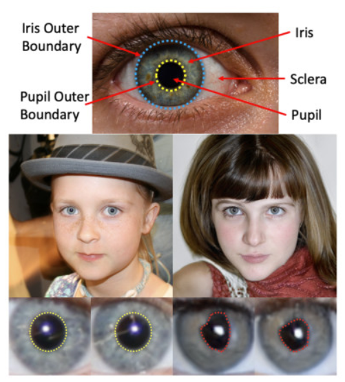 有科学家找到了一种检测伪造的方法,研究团队发现Deepfakes难以准确再现常规的瞳孔。真正的人类瞳孔是一个规则的椭圆形,而Deepfakes生成的瞳孔明显不规则,因为它对人脸结构没有生理常识。