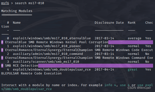 搜索ms17-010漏洞(rank列代表等级,越高越好)