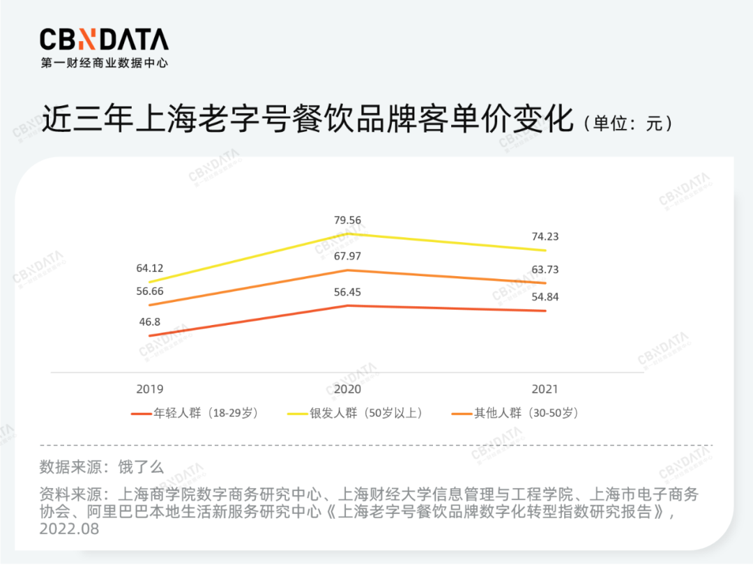 在新渠道内,老字号品牌对于年轻人群的吸引力更是有待加强。数据显示,30-50岁的中高龄人群是上海老字号餐饮品牌的主要在线消费群体,平均占比约73%。与银发人群比例提升相反,年轻人群的占比甚至略有下降。在三个人群中,年轻人群的老字号餐饮在线消费客单价也是最低的。