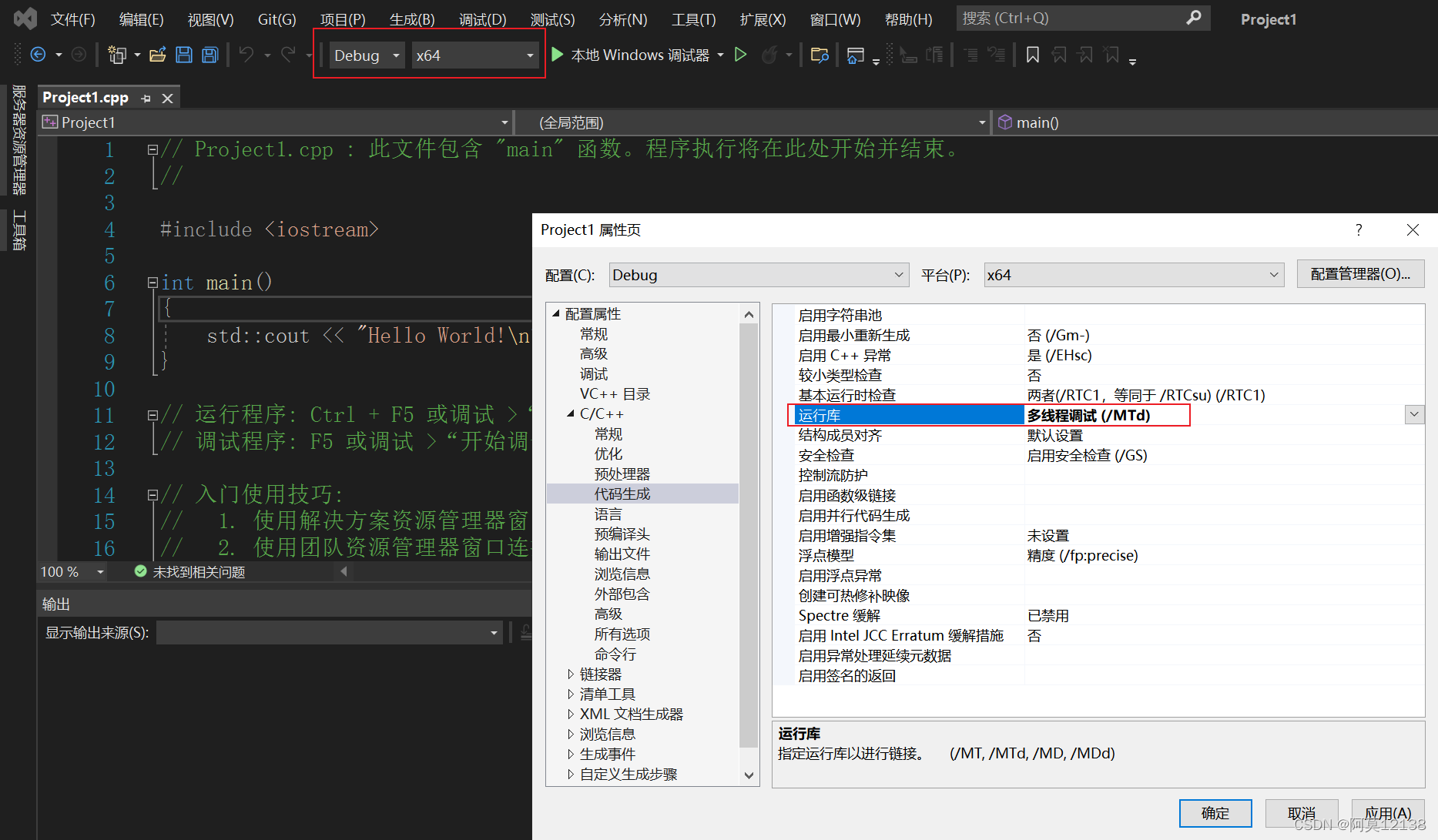 项目属性/C/C++/代码生成/运行库:多线程调试(/MTd)
