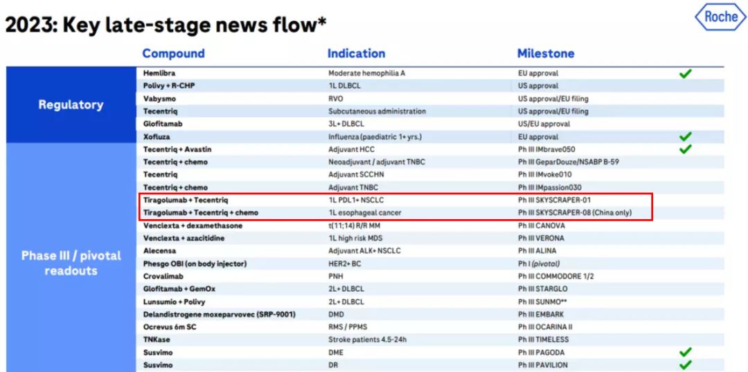 通常,III期临床样本量的增加,加大了临床的操作难度,后期临床的失败并不鲜见。所以,罗氏并不气馁,他们并在公告中强调,联合治疗带来数值上的改善,研究将继续进行,直至下一次中期分析及OS分析。对2023年的展望中,罗氏也把TIGIT资产列在值得关注的计划内。