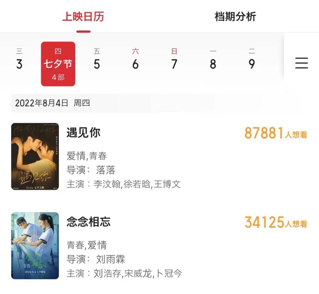 《遇见你》《念念相忘》这两部青春片则早早瞄准了七夕节。由于定档较早、距离上映还有一段时间,目前这两部作品均未开启密集宣传动作,但从影片定位和调性来看,都是标准的“爱情档”影片,称得上稳扎稳打。