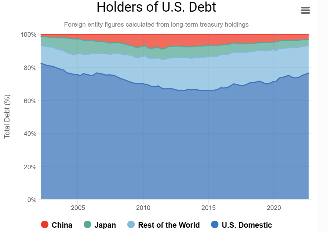 然而事实上,情况并没有这么简单。首先由于美国国债被视为优质资产,其投资者是极其多样化的。在下面的图表中,红色代表中国持有的美国国债占总体美国国债的比例。可以看到,这个比例在十年前达到高位后其实一直在不断缩减。