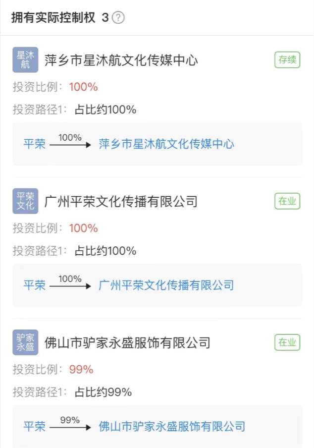 在直播账号背后,平荣名下还有多家服饰、日化类公司。不过,去年,二驴夫妇销售朵唯山寨手机事件后,平荣退出了多家公司,截至目前,其依旧有三家公司的实际控制权。
