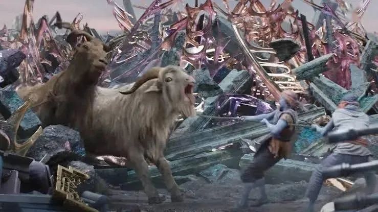又比如说虚拟世界视觉奇观方面,在《雷神》《奇异博士》《黑豹》中,我们尚且能看到大量有迹可循的场景设计理念,而《蚁人3》中的量子世界基本就等于是胡编乱造,对量子世界本土生物、世界的特征既没有来源也没有解释,仿佛创作者自己都没想好,就是为了讲故事强行搭建一个“星球大战”、“异星战场”般的场景,完全没有特点可言。