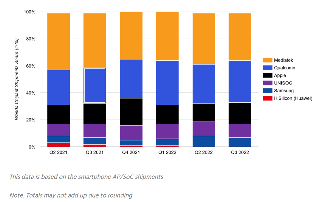 根据Counterpoint的全球智能手机 AP 市场报告显示,2022年Q3联发科的市场占比依旧位居第一,但份额已经从前一个季度的38%下滑到了35%,同比上一年也下滑 5%。与此同时,高通的市场份额增加到了31%,已经逼近联发科。
