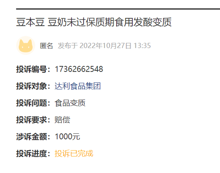 无独有偶,另有消费者于2022年10月26日在“多多买菜”平台购买6盒装“豆本豆”豆奶,次日饮用发现豆奶变质,发酸,随后出现腹泻情况。