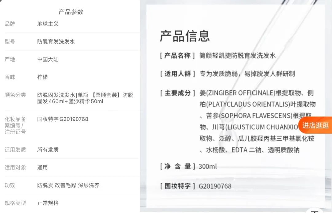 像这样“一证多牌”的套证现象,在当下的防脱发洗发水市场,极为普遍。比如2021年上线的新锐品牌“地球主义防脱固发洗发水”与“简颜轻凯捷防脱育发洗发水”对应的批准文号都是由肇庆市凯捷科技有限公司注册的“国妆特字G20190768”。发茉莉、bodyaid博滴和琴叶三个品牌则共享一张特证“国妆特字G20171993”。