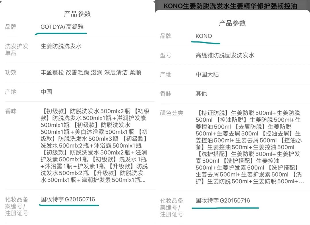 《未来迹Future Beauty》就发现,曾获得2021年度天猫金妆奖TOP单品奖的“KONO生姜防脱固发洗发水”,与“高缇雅防脱固发洗发水”的育发特证同为“国妆特字G20150716”。