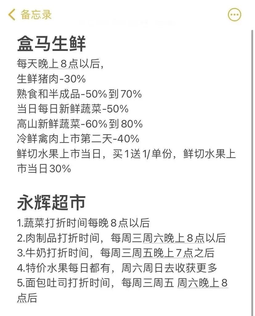 手机备忘录里的盒马鲜生和永辉超市打折攻略