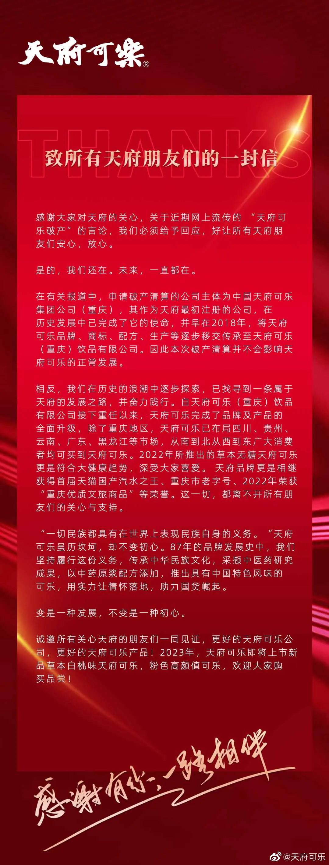 在信中,天府可乐表示,本次破产清算的公司主体为中国天府可乐集团公司(重庆),其作为天府最初注册的公司,在历史发展中已完成了它的使命。早在2018年,该公司就已将天府可乐品牌、商标、配方、生产等逐步移交传承至天府可乐(重庆)饮品有限公司。因此,本次破产清算并不会影响天府可乐的正常发展。