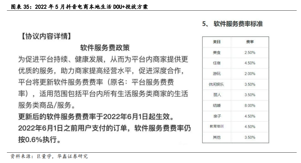 2022年5月,抖音在“巨量学”官网发布《2022年生活服务软件服务费标准说明》,明确6月1日起将对生活服务业务收取服务费。如下图所示,抖音电商各商品类目中,结婚类费率最高,为8%,其次是住宿、亲子、教育培训的4.5%,游玩类费率最低,为2%,美食类费率为2.5%,平均费率约3%,相较于美团均费率偏低。