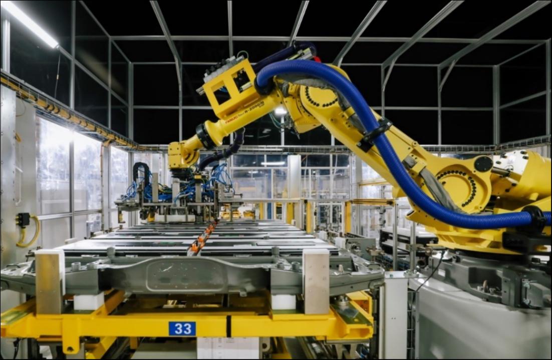 电池模组拧紧工位首次使用六轴全自动一次性拧紧的装配技术,相比同类工艺效率提升50%,且拧紧过程关键参数扭矩、角度可100%监控与追溯,工艺精度和质量达到行业领先。