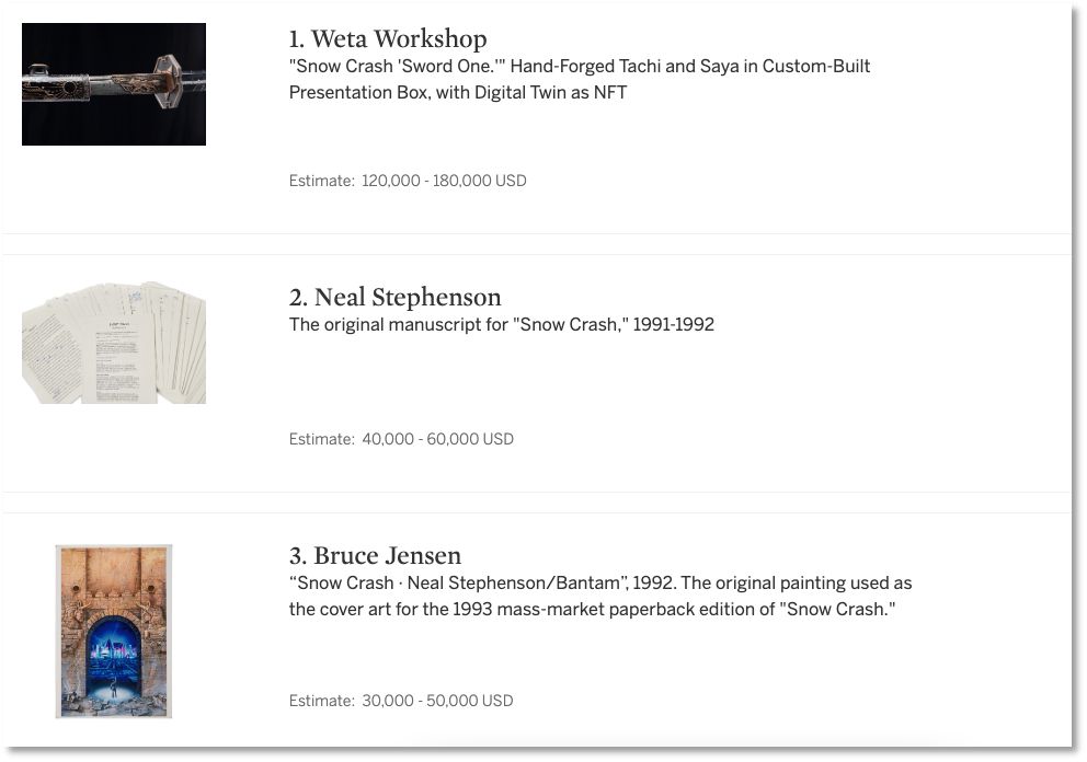 事实上,自从元宇宙概念火了之后,斯蒂芬森有意强化他“元宇宙”之父的人设,并借助《雪崩》的影响力进行商业变现。3月初,斯蒂芬森联合苏富比拍卖行举办了一次拍卖会,拍品包含《雪崩》的原稿、原始排版手稿、出版时的封面、小说原画中的皮夹克等等,每件拍品的价格从6000美元到18万美元不等。去年10月,他还在社交媒体上公布了《雪崩》新豪华精装版图书,为这本“重装书”的发售预热。