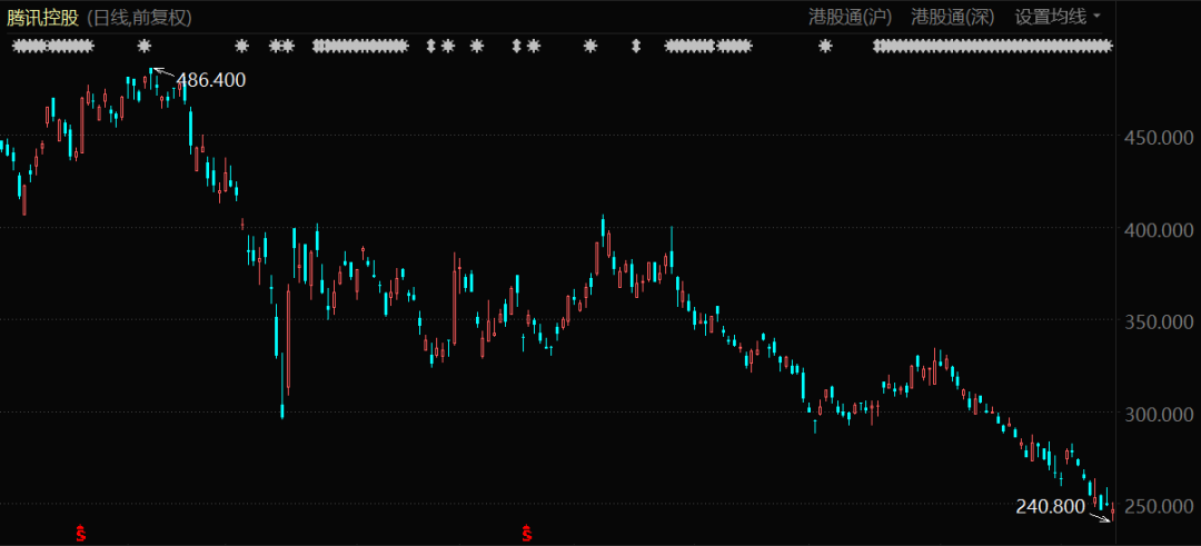 港交所里,腾讯股价颓废,开启大规模回购,试图提振二级市场的信心,但仍然一度跌到了每股240港元左右、市盈率仅剩11倍。
