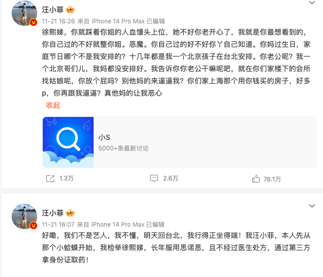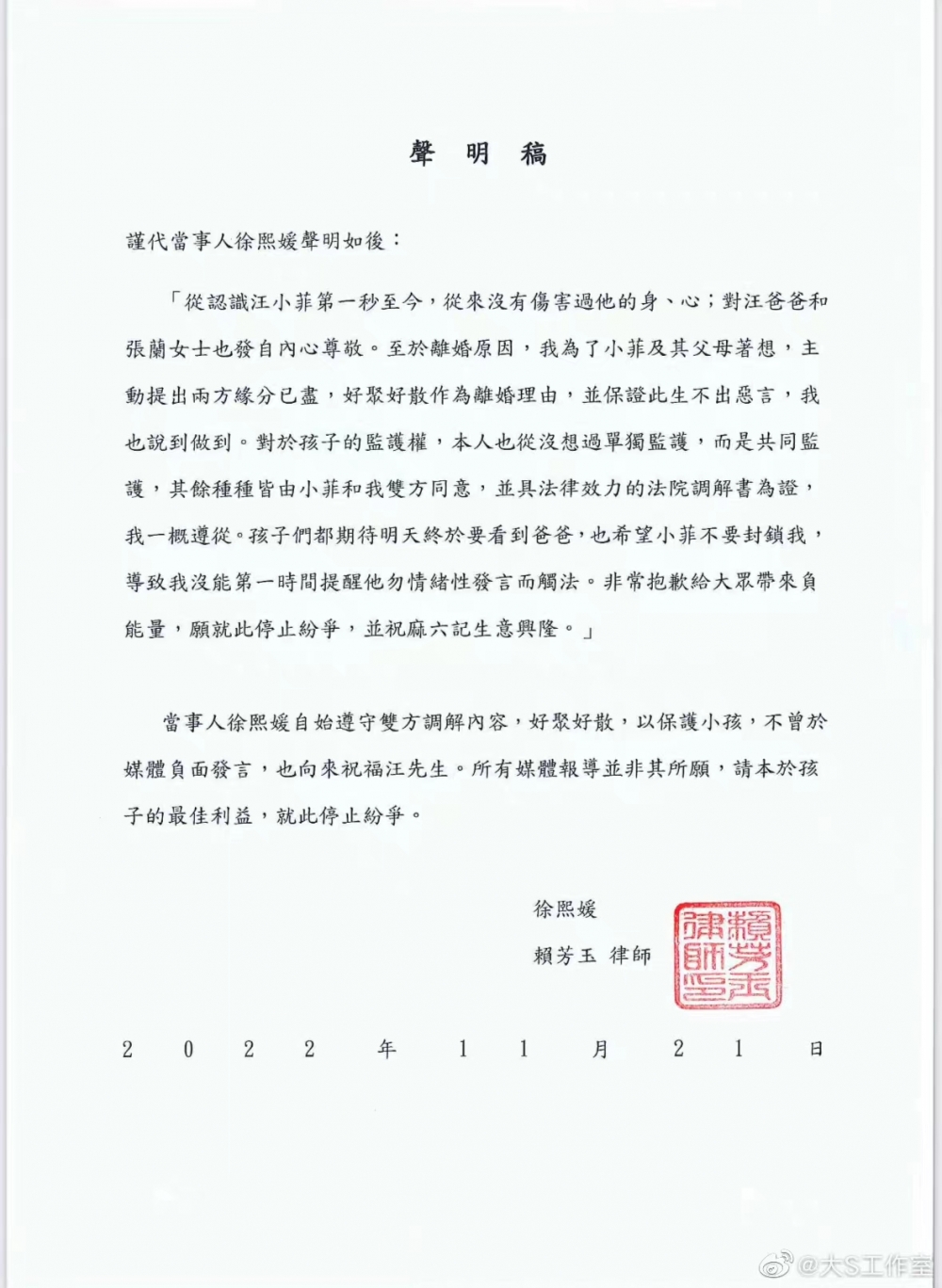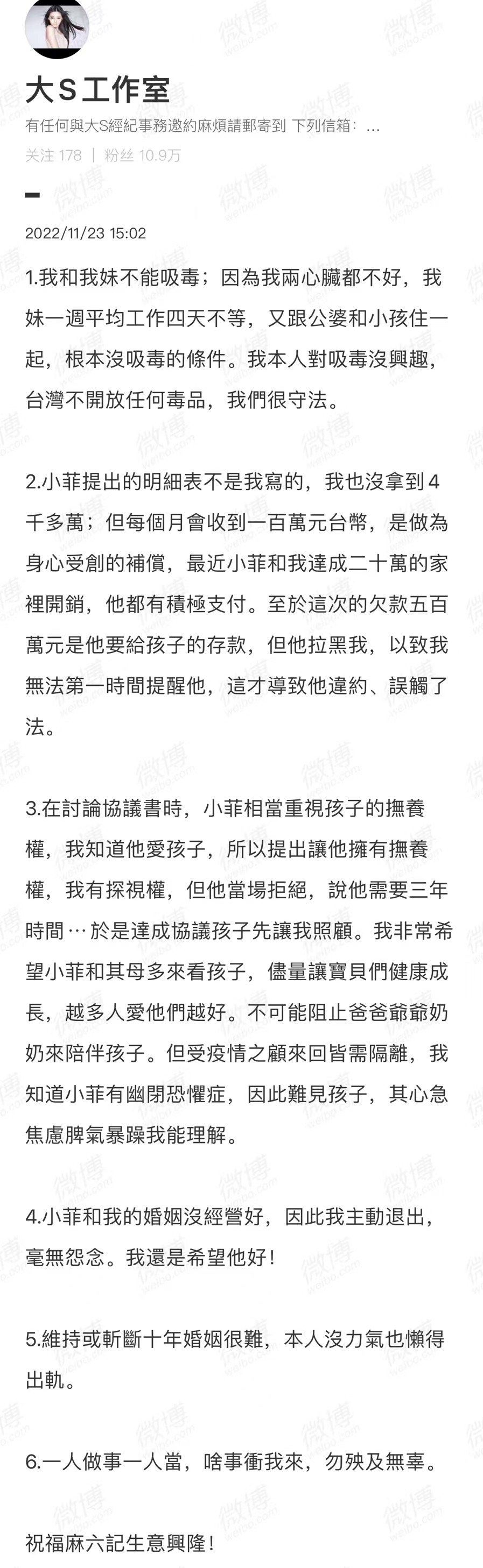 第一次的回应文本里,大多数是姿态性的表述,但比起23条语序混乱,情绪化的强火力输出,大S的声明冷静有序,怪不得网友评价是个体面人。