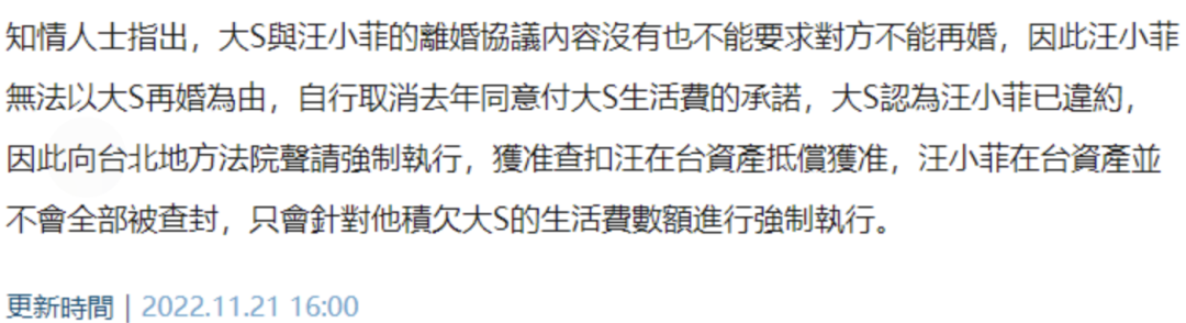 大S经常恐吓汪小菲,逼迫他妥协;经常侮辱张兰,不许她看看孙子、早就想和韩国光头结婚;在离婚时承诺不会再婚,只想安心抚养孩子,因此汪小菲把“再婚后不负赡养费”的条款删掉了;离婚后以各种理由加码给她钱;大S指控汪小菲没有给足赡养费,其实汪小菲多给了500多万。