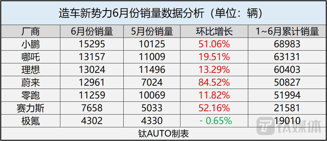 主要造车新势力企业6月交付量集体破万辆,小鹏汽车以15295辆领跑,蔚来以84.52%的增幅,销售12961辆的成绩重新回到榜单前列。哪吒汽车持续高歌猛进,交付量近13157辆,同比增长156%,环比增长接近20%,实现连续24个月同比增长继续保持第二的位置。理想交付13024辆,环比增长13%,销量保持稳定,持续稳步上涨。
