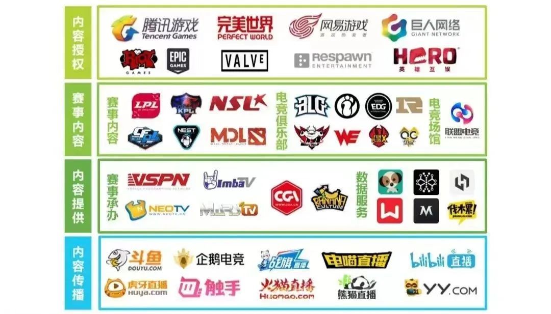 上游有腾讯、网易、完美世界等游戏厂商,中游有腾讯电竞、网易NeXT、英雄体育等赛事运营商和众多战队俱乐部;