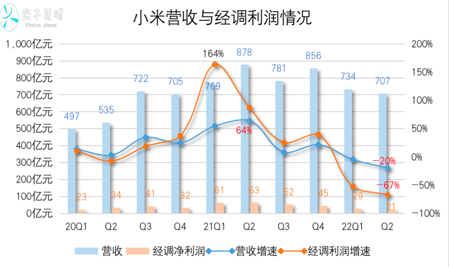 8月19日,小米披露2022年第二季度与半年报,数据显示,Q2小米实现营收702亿元,同比下滑20%,经调净利润21亿元,同比降低67%。