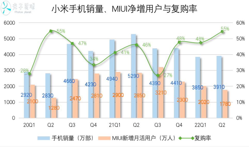 考虑到小米上半年及时调整策略,推出面向细分市场的新机,其目的在于开拓用户、稳住销量,照理来说是会导致复购率下滑才对,可是却唤起了米粉的购买意愿。由于未能成功拓展新用户,宏观因素的影响让小米处于较为艰难的境地。