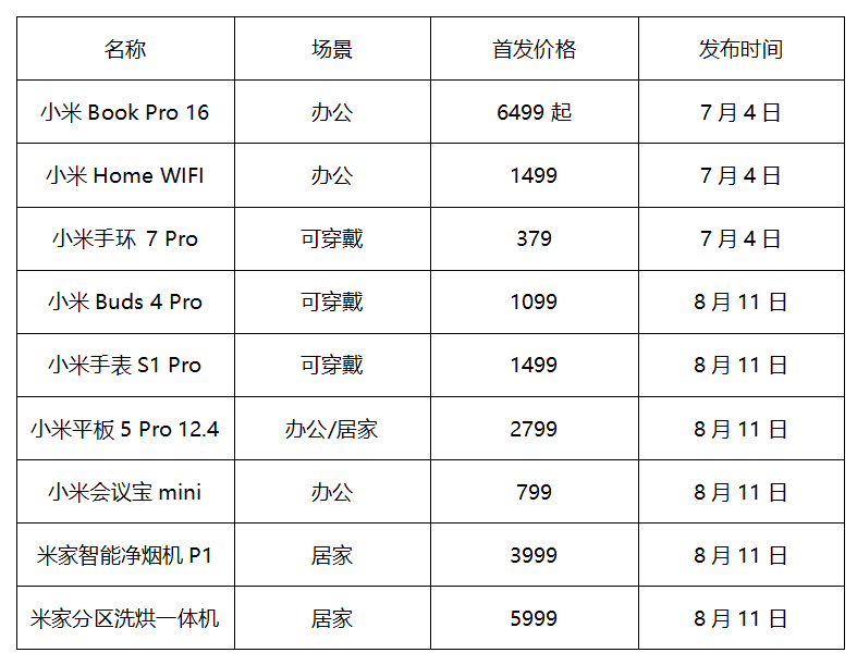 7月4日与8月11日分别发布了多款涉及办公、可穿戴、居家场景的IoT产品,且有不少是此前新品的升级版,因而价格也有明显增加。例如小米手环7 Pro相比小米手环7高了150元,小米手表S1 Pro相比S1首发价高了400元。