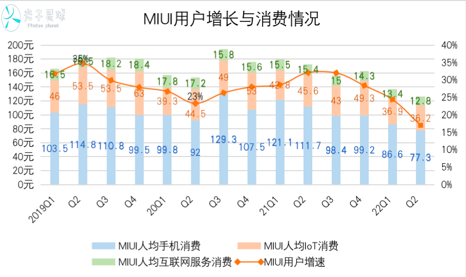 从过去14个季度的情况看,MIUI用户人均手机、IoT、互联网增值服务消费呈震荡走低的态势,截至今年Q2,依次为77.3元、36.2元、12.8元,人均消费总值为126.3元,为近年新低。此外,MIUI用户增速也首次跌破20%。