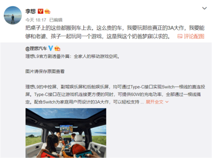 譬如理想,在发布L9车型之前,便对外宣传联手Switch首创“全家游戏空间”。理想汽车创始人李想也“借机”为L9造起了声势,并在微博上发声表态:“这么贵的车,我要玩那些真正的3A大作,我要能够和老婆、孩子一起玩同一个游戏,这是我这个奶爸梦寐以求的。”