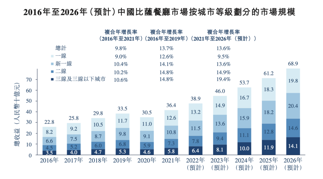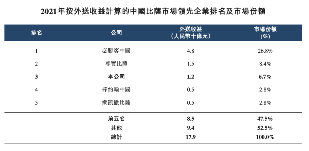 弗若斯特沙利文发布的中国比萨市场行业报告显示,预计比萨外送分部甚至将较整个中国比萨市场增长更快:2021年外送销售额为179亿元,占整个中国比萨市场的49.2%,预计2021年至2026年比萨外送分部将按19.9%的复合年增长率增至443亿元,占整个中国比萨市场的64.3%。