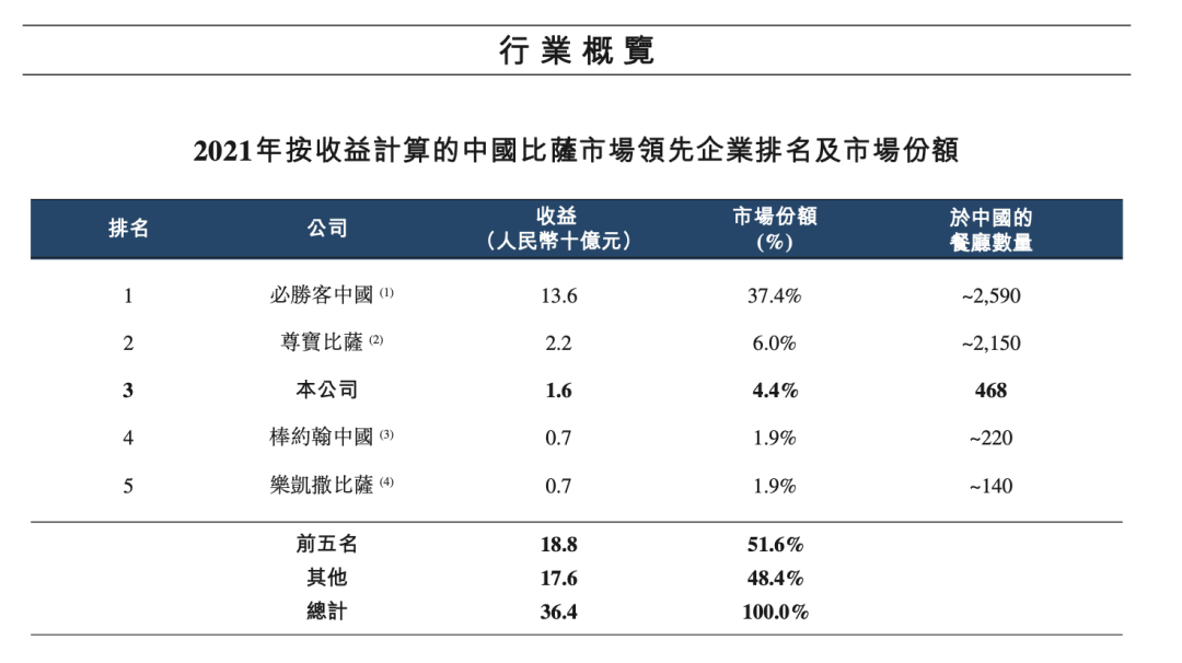 其招股中表示,中国的比萨市场还有较大的增长空间,2021年时市场规模为364亿元,与东亚市场其他国家相比,中国的比萨市场还远未到饱和状态。2021年中国每百万人拥有10.9家比萨店,而日本和韩国的这一数字均达到28家以上。
