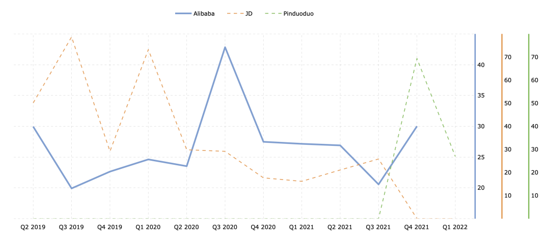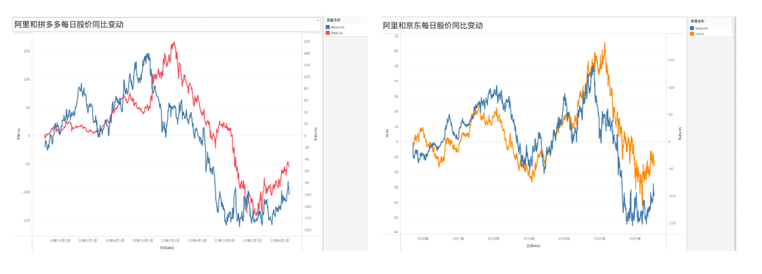 虽然三家公司一直互视对方为死敌,但其股价走势具有明显的相关性,值得注意的是,2020年末阿里遭遇监管压力之后,股价旋即下跌,4个月后京东和拼多多亦步其后尘,其后偶有高低起伏,但节奏保持着高度的一致性。