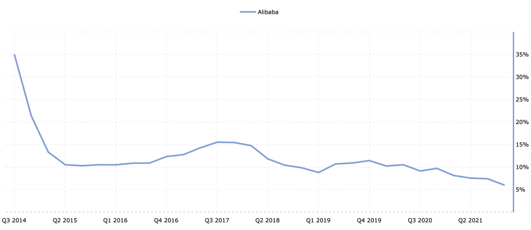在我们对阿里的观察中,发现了即便是监管对资本无序扩张不叫停,阿里自身也会结束的。理由为ROI(投资回报率)的长期持续下行,见下图: