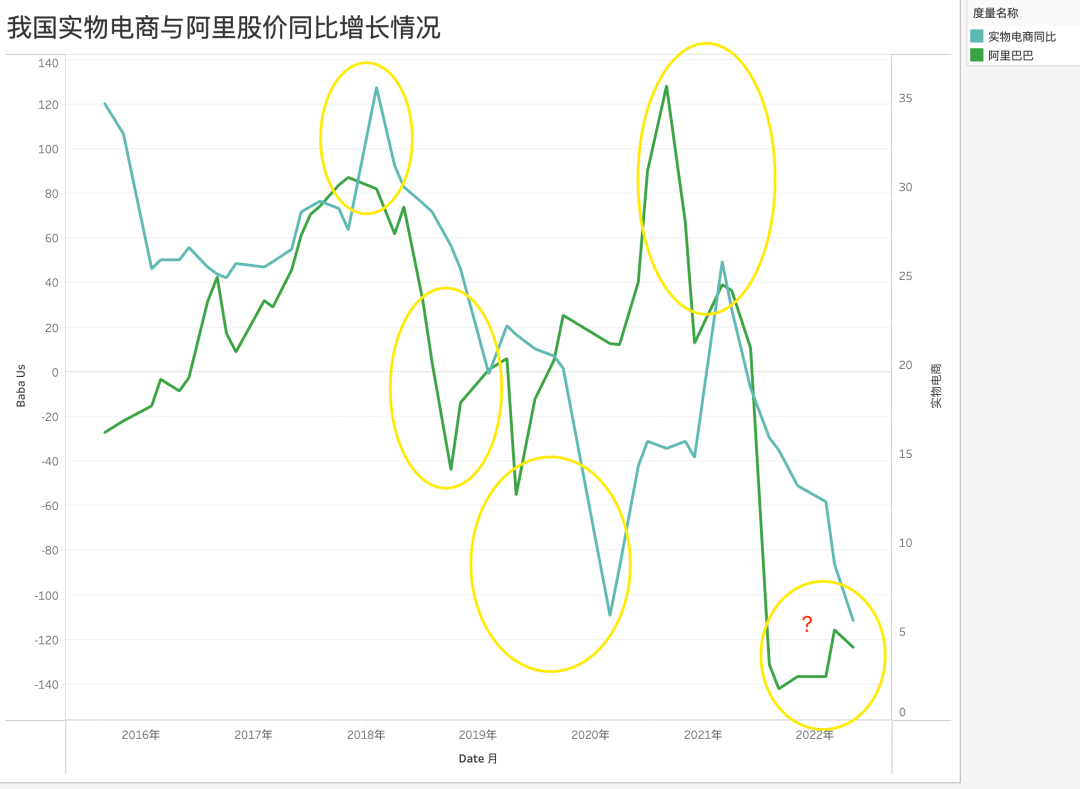 除此之外,两条线之所以略有凌乱,乃是两者波动的节奏略有不同,简单来说,阿里股价波动大致领先行业数据3-6个月,或者说阿里股价同比变化幅度可视为视为实物电商的前置数据。