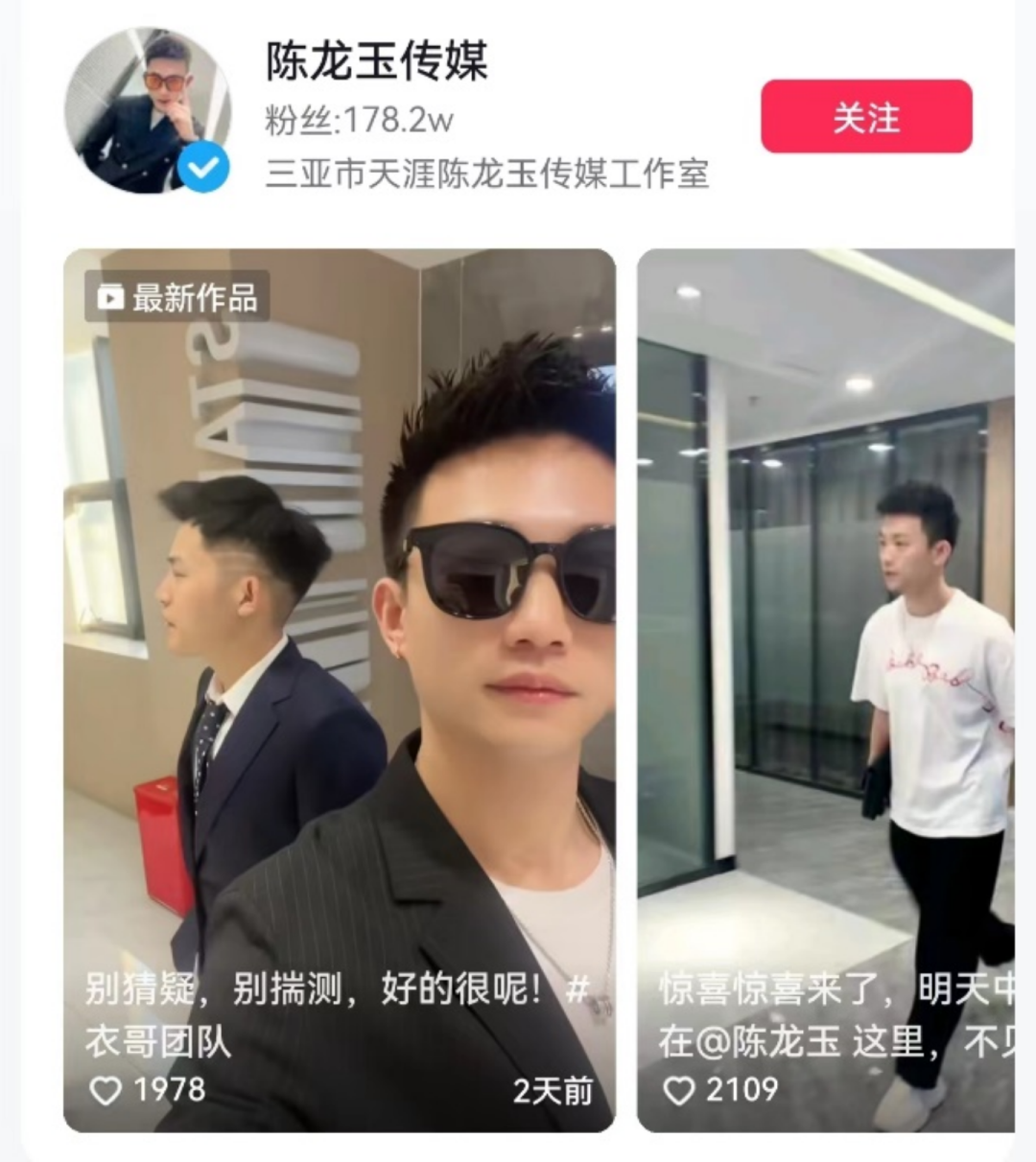 现在,陈龙玉在抖音共有300多万粉丝,还创立了个人传媒工作室,不论是短视频还是直播带货的玩法和套路,都和自己的师父“一脉相承”。