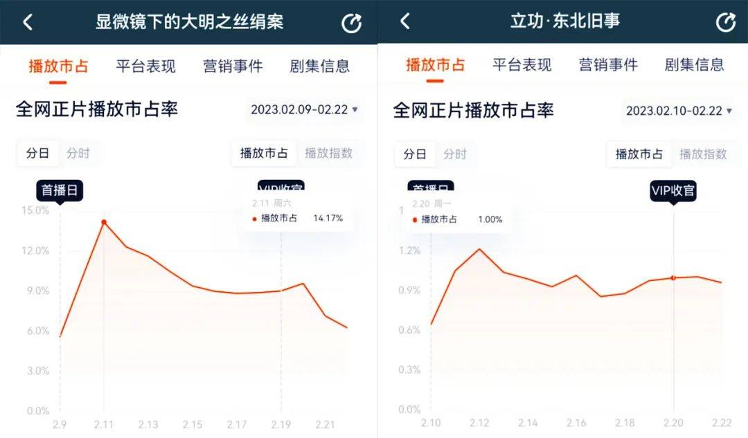 进入2023年春季,在各方面作用下,“黑马剧”的逻辑却在重新跑通,并表现出以好口碑拉动剧集表现的效率,比如爱奇艺的《显微镜下的大明之丝绢案》(简称《大明》)、优酷的《立功:东北旧事》(简称《立功》)等。