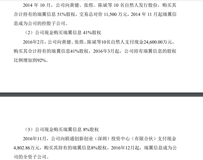 去年通鼎互联已将瑞翼信息进行“甩卖”。据悉,2014年、2016年、通鼎互联累计收购了瑞翼信息100%股权,总共耗资逾4亿元。