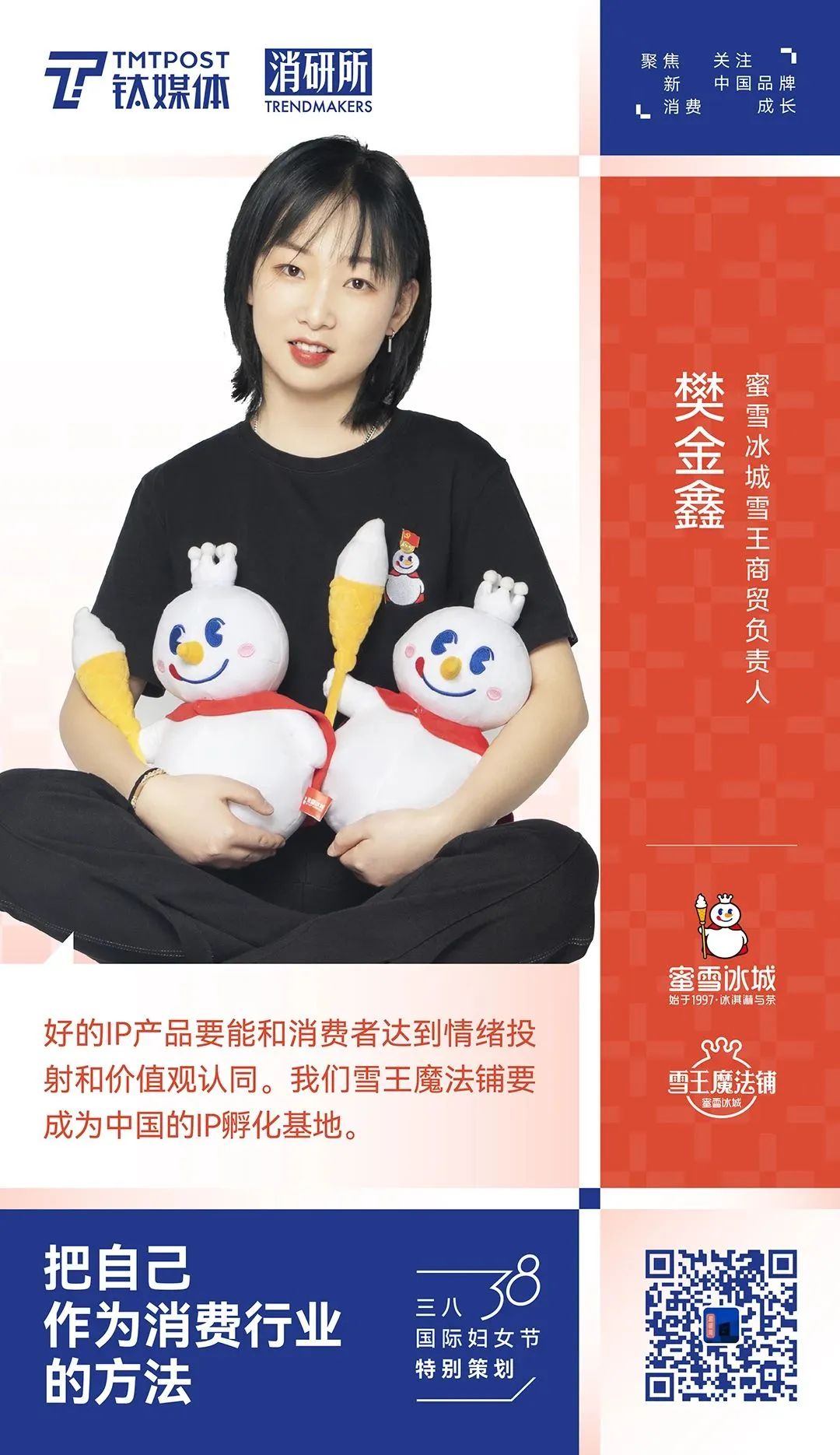 樊金鑫,蜜雪冰城雪王IP所有周边产品背后的总操盘手。从入职时的90后平面设计师到现在蜜雪冰城雪王魔法铺负责人,她见证和主导了雪王魔法铺从零到一的诞生、成长。从2018年雪王IP诞生至今,蜜雪冰城魔法铺已经拥有袋泡茶、零食、杯子、文创周边等多个品类的产品线,其中爆款玩具销售超过千万,雪王的一举一动频频在社交媒体引起互动,甚至有网友自己购买雪王气模当做一种表达方式,魔法铺也被期望成为蜜雪冰城新的增长曲线。一系列爆款经验和超预期的产品,都让她更加坚定自己的目标,要把未来的魔法铺打造成中国的IP孵化基地。