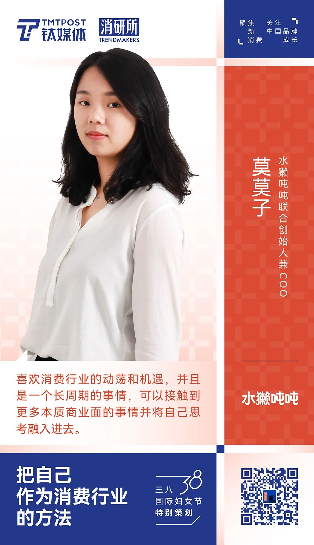 莫莫子,水獭吨吨品牌联合创始人兼COO,有超过10年视频产品策划及研发和供应链管理经验,对产品的开发和消费者需求有着深刻的洞察,曾经带领团队做出过新消费领域爆款产品。 2021年4月创立水獭吨吨,担任品牌联合创始人兼COO,负责产品开发、供应链管理和团队管理。
