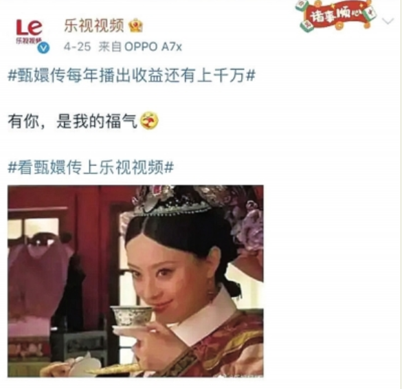 乐视还活着的消息一出,大家纷纷调侃“《甄嬛传》保了乐贵妃一辈子的荣华富贵”。
