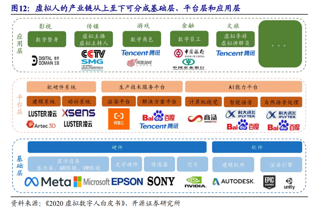 还需要特别关注的是百度、腾讯、阿里等头部综合大厂,他们基于自身在底层技术、硬件架构上的沉淀,在产业链布局时会相对全面,往往会提供相应的数字人技术服务平台,以及面向不同行业的解决方案。