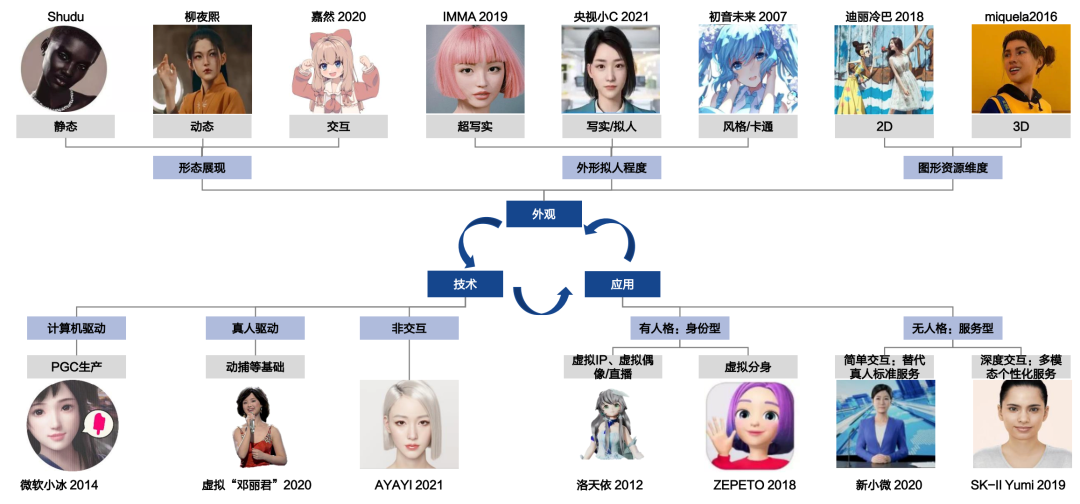 从应用层来看,当前主流的虚拟人可以分为两种类型:服务型虚拟人和身份型虚拟人。前者主要用于代替真人服务,是现实世界中服务型角色的虚拟代表;后者多为虚拟IP/偶像,意在推动虚拟内容的生产,也可以是虚拟世界里用户的第二分身。